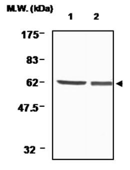 WB analysis of cell lysates. Lane 1: HeLa cells. Lane 2: Jurkat cells. |