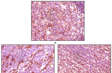 Figure 2: Immunohistochemical analysis of paraffin-embedded human lymph tissue (A), glioma tissue (B) and cerebellum tissue (C), showing membrane localization using Dynamin1 mouse mAb with DAB staining |