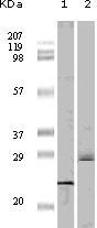 Figure 1: Western blot analysis using 4E-BP1 mouse mAb against truncated 4E-BP1 recombinant protein(1)and A431 cell lysate (2).