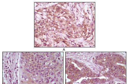 Figure 2: Immunohistochemical analysis of paraffin-embedded human pancreas carcinoma (A), esophagus carcinoma tissue (B) and ovary tumor tissue (C), showing cytoplasmic and membrane localization using 4E-BP1 mouse mAb with DAB staining. |