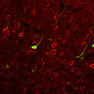 Glutamate Receptor (Metabotropic) Type 1 (mGluR1) mGluR1-staining of cortical neurons in an adult transgenic mouse brain (red staining); Green staining is GFP-immunoreactivity for a subpopulation of cortical neurons. |