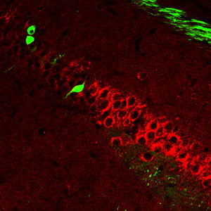 Glutamate Receptor (Metabotropic) Type 3 (mGluR3) mGluR3-staining of pyramidal neurons in the hippocampal formation of an adult transgenic mouse brain (red staining); Green staining is GFP-immunoreactivity for a subpopulation of cortical neurons. |