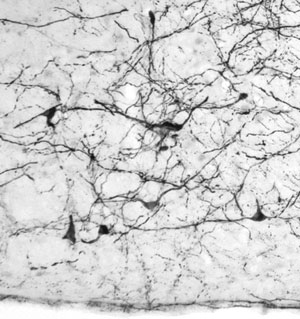 Tyrosine Hydroxylase (TYH) TH-positive neurons (red) in the substantia nigra of a GFP-expressing transgenic mouse. |