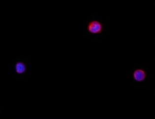 DPPIV/CD26 in Human PBMCs. DPPIV/CD26 was detected in immersion fixed human peripheral blood mononuclear cells (PBMCs) using Goat Anti-Human DPPIV/CD26 Antibody at 10 μg/mL for 3 hours at RT. Cells were stained using the Northern Lights 557-conjugated Anti-Goat IgG Secondary Antibody (yellow) and counterstained with DAPI (blue).
