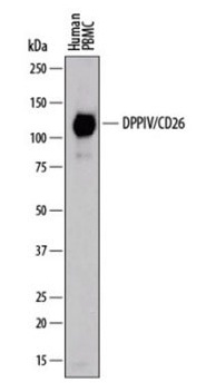 Detection of Human DPPIV/CD26 by Western Blot. Western blot shows lysates of human peripheral blood mononuclear cells (PBMC). PVDF membrane was probed with 0.2 μg/mL of Goat Anti-Human DPPIV/CD26 Antibody followed by HRP-conjugated Anti-Goat IgG Secondary Antibody. A specific band was detected for DPPIV/CD26 at approximately 110 kDa (as indicated). |
