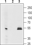 Western blot analysis using Anti-Kir3.1 (GIRK1) (extracellular) mouse monoclonal antibody ( AMM06204G), (1:200):1. HEK cells transfected with human Kir3.1.2. HEK cells transfected with control vector.3. Mouse heart lysate. |