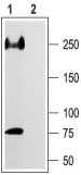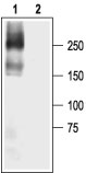 Western blot analysis of Nav1.5 in human-Nav1.5 transfected HEK-293 cells: 1. Anti-Na 1.5 antibody ( AMM06564G), (1:200). 2. Anti-Na 1.5 antibody, preincubated with the control peptide antigen.