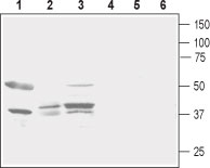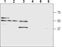 Western blot analysis of rat brain lysate (lanes 1 and 4), rat stomach lysate (lanes 2 and 5) and mouse kidney lysate (lanes 3 and 6): 1-3. Anti-Prostanoid EP2 Receptor (extracellular) antibody ( AMM07346G), (1:500). 4-6. Anti-Prostanoid EP2 Receptor (extracellular) antibody, preincubated with the control peptide antigen.