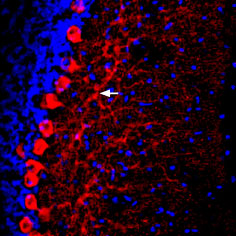 Expression of Prostanoid EP2 Receptor in rat cerebellum Immunohistochemical staining of perfusion-fixed frozen rat brain sections using Anti-Prostanoid EP2 Receptor (extracellular) antibody ( AMM07346G), (1:100). Prostanoid EP2 Receptor staining (red) is detected inPurkinje neurons and their dendritic tree (arrow). Blue is DAPI nissl counterstain. |