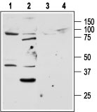Western blot analysis of rat lung (lanes 1 and 3) and liver (lanes 2 and 4) lysates: 1, 2. Anti-Protease-Activated Receptor-2 antibody ( AMM07348G), (1:400). 3, 4. Anti-Protease-Activated Receptor-2 antibody, preincubated with the control peptide antigen.