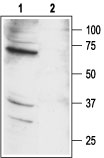 Western blot analysis of mouse kidney lysates: 1. Anti-Protease-Activated Receptor-2 antibody ( AMM07348G), (1:400). 2. Anti-Protease-Activated Receptor-2 antibody, preincubated with the control peptide antigen. |