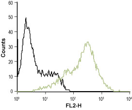 Indirect flow cytometry analysis of MEG-O1 living cells: Unstained cells. Cells + Anti-P2Y12 Receptor (extracellular) antibody ( APR12696G), (5-10 g/1x10<sup>6</sup> cells). |