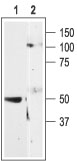 Western blot analysis human platelet lysates: 1. Anti-P2Y11 Receptor antibody ( APR12695G), (1:200). 2. Anti-P2Y11 Receptor antibody, preincubated with the control peptide antigen.