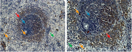 Expression of P2Y11 receptor in rat spleen Immunohistochemical staining of rat spleen using Anti-P2Y11 Receptor antibody ( APR12695G). Secondary (activated) follicle in the spleen white pulp shows intense staining of Marginal Zone T lymphocytes (red arrow); note that cells in the red pulp (green arrow) and B lymphocytes in the germinal center (blue arrow) are not stained. Yellow arrows show mononuclear cells with intense stain, probably non specific due to very high intrinsic peroxidase activity. DAB product is brown and cresyl violet is used as the counterstain. The two images are the same at different augmentation (Left pane 200x and right pane 400x).