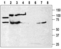 Western blot analysis of rat brain membranes (lanes 1,5) and human cell lines; K562 (lanes 2 and 6); WEHI-231 (lanes 3 and 7) and HL-60 (lanes 4 and 8): 1-4. Anti-P2X7 Receptor (extracellular) antibody ( APR12692G), (1:200). 5-8. Anti-P2X7 Receptor (extracellular) antibody, preincubated with the control peptide antigen.