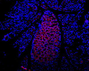 Expression of P2X7 in rat pancreas Immunohistochemical staining of rat pancreas frozen section using Anti-P2X7 Receptor (extracellular) antibody ( APR12692G), (1:100), followed by mouse anti-rabbit-AlexaFluor-594 secondary antibody (red). Staining is present in endocrine cells of the Isle of Langerhans. Hoechst 33342 is used as the counterstain. |