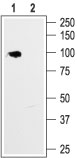 Western blot analysis of rat brain membrane: 1. Anti-HCN1 antibody ( APR12347G), (1:200). 2. Anti-HCN1 antibody, preincubated with the control peptide antigen.