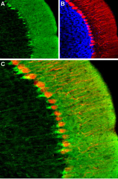 Expression of HCN1 in mouse cerebellum Immunohistochemical staining mouse cerebellum using Anti-HCN1 antibody ( APR12347G). A. HCN1 (green) appears in the cerebellar pinceau. B. Calcium binding calbindinD28-K (red), a marker of Purkinje neurons, is stained in the same section. C. Merge of the images demonstrates the position of the HCN1-positive pinceau structures at the axon initial segment of Purkinje neurons.