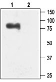 Western blot analysis of rat brain membranes: 1. Anti-K Ca 2.3 (SK3) (N-term) antibody ( AMM06065G), (1:200). 2. Anti-K Ca 2.3 (SK3) (N-term) antibody, preincubated with the control peptide antigen.
