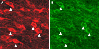 Expression of K Ca 2.3 in mouse dopaminergic neurons Immunohistochemical staining of mouse dopaminergic neurons using Anti-K Ca 2.3 (SK3) (N-term) antibody ( AMM06065G). A. K Ca 2.3 is detected in substantia nigra pars compacta. B. Tyrosine hydroxylase staining shows dopaminergic neurons. Triangles point at cells with co-localization. |