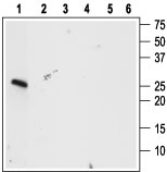 Western blot analysis using Anti-proBDNF antibody ( AMR09549G), (1:400): 1. proBDNF (WT-human) ( B-257), (20 ng). 2. proNGF (WT-human) ( N-280), (200 ng). 3. recombinant proNT-3 (200 ng). 4. hBDNF ( B-250), (200 ng). 5. mNGF 2.5S (Grade II) ( N-100), (200 ng). 6. hNT-3 ( N-260), (200 ng).