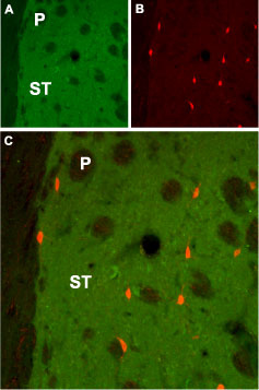 Expression of M1 in mouse striatum Immunohistochemical staining of mouse striatum (ST) using Anti-M1 Muscarinic Receptor antibody ( APR12487G). A. M1 Muscarinic Receptor appears in the striatum (green). B. Staining of interneurons with mouse anti-parvalbumin (PV, red). C. Confocal merge of M1 Muscarinic Receptor and PV demonstrates localization of PV expressing neurons in the striatal matrix; not in striatal patches (P). |