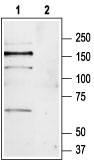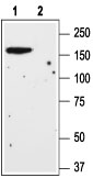Western blot analysis of rat brain lysate: 1. Anti-mGluR1 (extracellular) antibody ( AMM06390G), (1:200). 2. Anti-mGluR1 (extracellular) antibody, preincubated with the control peptide antigen.