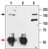 Immunoprecipitation of rat brain lysate: 1. Cell lysate + protein A beads + Anti-mGluR1 (extracellular) antibody ( AMM06390G). 2. Cell lysate + protein A beads + pre-immune rabbit serum. 3. Cell lysate. |