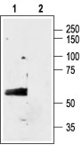 Western blot analysis of rat brain membranes: 1. Anti-GABA(A) α 3 Receptor (extracellular) antibody ( APR11954G), (1:200). 2. Anti-GABA(A) α3 Receptor (extracellular) antibody preincubated with the control peptide antigen.