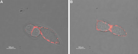 Expression of GABA(A) α3 Receptor in rat insulinoma cell line Immunocytochemical staining of intact living rat RIN-m cells using Anti- GABA(A) α3 Receptor (extracellular) antibody ( APR11954G), (1:50) followed by goat anti-rabbit-AlexaFluor-550 secondary antibody. Extracellular staining (red) merged with live view of the cells.