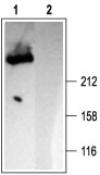 Western blot analysis of rat brain membranes: 1. Anti-IP3 Receptor-1 antibody ( APR08011G), (1:2000). 2. Anti-IP3 Receptor-1 antibody, preincubated with the control peptide antigen.