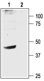 Western blot analysis of rat brain membranes: 1. Anti-Kir3.2 (GIRK2) antibody ( AMM06206G), (1:200). 2. Anti-Kir3.2 (GIRK2) antibody, preincubated with the control antigen. |