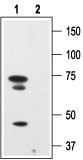 Western blot analysis of human melanoma cells A875: 1. Anti-Human p75<sup>NTR </sup>(extracellular) antibody ( APR12426G), (1:200). 2. Anti-Human p75<sup>NTR </sup>(extracellular) antibody, preincubated with the control peptide.