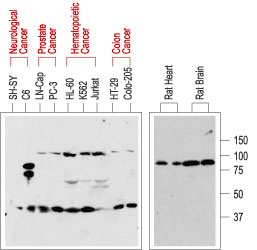 Western blot analysis of normal rat tissue (right) and in human cancer cell lines (left): p75<sup>NTR</sup> is visualized with Anti-Human p75<sup>NTR</sup> (extracellular) antibody ( APR12426G), (1:200). Note that human cancer cell lines from hemapoietic origin show high p75<sup>NTR</sup> expression, while cell lines from prostate and colon cancer origin show lower levels. Interestingly, p75<sup>NTR</sup> from rat (right blot and the C6 cell line) and human (left blot) samples run with a different apparent MW, probably due to species-specific differential glycosylation. |
