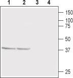 Western blot analysis of rat brain (lanes 1 and 3) and mouse brain (lanes 2 and 4) membranes: 1, 2. Anti-Calcium-binding protein 1 antibody ( APG03196G), (1:600). 3, 4. Anti-Calcium-binding protein 1 antibody preincubated with the control antigen. |