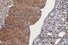 Expression of TRPC3 in rat pituitary gland 、Immunohistochemical staining of rat pituitary gland paraffin embedded sections using Anti-TRPC3 antibody ( APR13807G), (1:100). TRPC3 is mainly expressed in the adenohypophysis (on left). Hematoxilin is used as the counterstain.