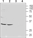 Western blot analysis of rat brain (lanes 1 and 3) and mouse brain (lanes 2 and 4) lysates:1, 2. Anti-CaVγ7 (extracellular) antibody, (1:1000).3, 4. Anti-CaVγ7 (extracellular) antibody preincubated with the control peptide antigen. |