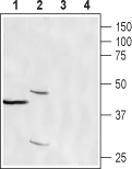 Western blot analysis of human T cell leukemia (Jurkat) (lanes 1 and 3) and rat stomach (lanes 2 and 4) lysates:1,2.Anti-CRAC Channel Regulator 2A antibody, (1:400).3,4. Anti-CRAC Channel Regulator 2A antibody preincubated with the control peptide antigen. |