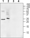 Western blot analysis of mouse brain membranes (lanes 1 and 3) and human Malme-3M melanoma cell lysate (lanes 2 and 4):1, 2. Anti-Ephrin-A1 (extracellular) antibody ( APR11875G), (1:200).3, 4. Anti- Ephrin-A1 (extracellular) antibody, preincubated with the control peptide antigen.