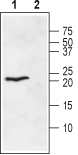 Western blot analysis of rat heart membranes:1.Anti- Ephrin-A1 (extracellular) antibody ( APR11875G), (1:400).2. Anti- Ephrin-A1 (extracellular) antibody, preincubated with the control peptide antigen.