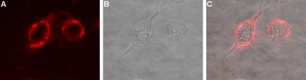Expression of Ephrin-A1 in rat PC12 cells Immunocytochemical staining of live intact rat PC12 pheochromocytoma cells. A. Extracellular staining of cells with Anti-Ephrin-A1 (extracellular) antibody ( APR11875G), (1:50), followed by goat anti-rabbit-AlexaFluor-594 secondary antibody (red). B. Live view of the cells. C. Merge of A and B. |