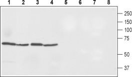 Western blot analysis of rat spleen (lanes 1 and 5), rat small intestine (lanes 2 and 6), rat liver (lanes 3 and 7) and mouse liver (lanes 4 and 8) lysates.1-4.Anti-Ferroportin antibody ( AMM04531G), (1:500).5-8. Anti-Ferroportin antibody preincubated with the control peptide antigen. |