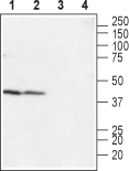 Western blot analysis of rat heart (lanes 1 and 3) and mouse heart (lanes 2 and 4) membranes:1, 2. Anti-LPA4 Receptor (extracellular) antibody ( AMM06325G), (1:500).3, 4. Anti-LPA4 Receptor (extracellular) antibody preincubated with the control peptide antigen.