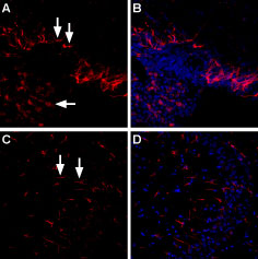 Expression of LPA4 receptor in rat and mouse brain Immunohistochemical staining of rat choroid plexus and mouse hippocampal CA3 region using Anti-LPA4 Receptor (extracellular) antibody ( AMM06325G), (1:400). A. LPA4 Receptor staining (red) in rat choroid plexus appears in astrocytes (vertical arrows) and in cells of the choroid plexus (horizontal arrow). C. LPA4 Receptor staining (red) in mouse hippocampal CA3 region is detected in astrocytes (arrows). B, D. nuclear staining using DAPI as the counterstain (blue). |