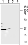 Western blot analysis of human Chronic myelogenous leukemia MEG-01 (lanes 1 and 3) and K562 cell lysates (lanes 2 and 4):1, 2. Anti-Human LPA5 Receptor (extracellular) antibody ( APR16787G), (1:200).3, 4. Anti-Human LPA5 Receptor (extracellular) antibody preincubated with the control antigen. |