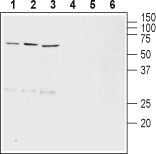 Western blot analysis of rat brain lysate (lanes 1 and 4); mouse brain lysate (lanes 2 and 5) and rat brain stem lysate (lanes 3 and 6):1-3.Anti-Vesicular Monoamine Transporter 2 antibody ( APR13958G), (1:400).4-6. Anti-Vesicular Monoamine Transporter 2 antibody, preincubated with the control peptide antigen.