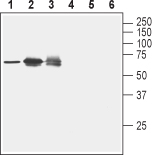 Western blot analysis of rat spleen lysate (lanes 1 and 4), human Jurkat T cell leukemia cell lysate (lanes 2 and 5) and human K562 erythroleukemia cell lysate (lanes 3 and 6):1-3.Anti-Nectin-2 (extracellular) antibody ( APR11148G), (1:200).4-6. Anti-Nectin-2 (extracellular) antibody, preincubated with the control peptide antigen.