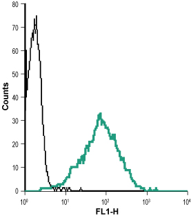 Indirect flow cytometry analysis of live intact human Jurkat T cell leukemia cells: ——Cells + goat-anti-rabbit-Alexa-488. ——Cells + Anti-Nectin-2 (extracellular) antibody ( APR11148G), (1:15) + goat-anti-rabbit-Alexa-488. |