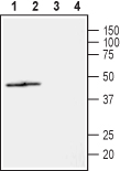 Western blot analysis of rat (lanes 1 and 3) and mouse heart (lanes 2 and 4) lysates:1,2.Anti-NIPA2 (extracellular) antibody ( APR17271G), (1:200).3,4. Anti-NIPA2 (extracellular) antibody preincubated with the control peptide antigen.
