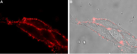 Expression of NIPA2 in rat C6 cells Immunocytochemical staining of rat brain glioma C6 cells. A. Extracellular staining of cells with Anti-NIPA2 (extracellular) antibody ( APR17271G), (1:50, (red). B. Merged image of A with live view of cell. |